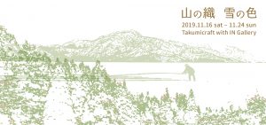 2019年11月16日から24日まで、タクミクラフト初となる東京での主催展示「山の織 雪の色」展を開催いたしました。会場となったIN Galleryへご来場いただきました皆さま、誠にありがとうございました。連日さまざまな出会いが生まれた7日間の展示期間(会期中18・19日休廊)を振り返り、会場の雰囲気をお届けいたします。