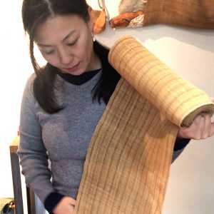 大滝さんの背後に見えるのは、彼女が考案した複雑な織が美しい羽越しな布の反物です。反物がかかっているのは丸めたシナの木の皮。こちらも産地 山熊田から、遠路はるばる東京へやってきました。