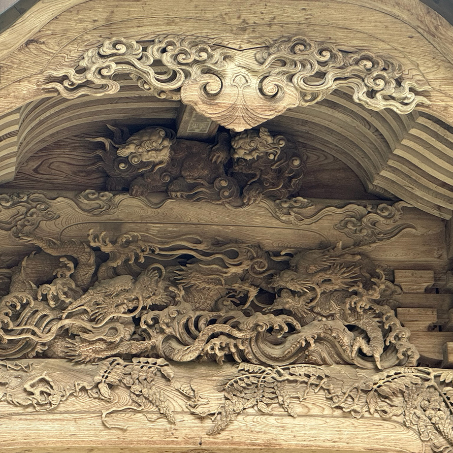 村上木彫堆朱の祖とも呼ばれる、名工「有磯周斎(ありいそ しゅうさい)」による精緻な彫刻の数々。一本の木から彫出し立体的に仕上げる「籠彫り」と呼ばれる技法で製作されています。梁には神紋である「下り藤」の装飾も。