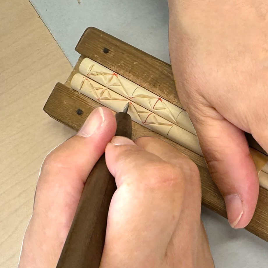 たった1膳のお箸でも、必死で彫っていると普段使わない指の筋肉が攣りそうでしたが、本職の方はこれを10セットくらい一列に並べて、大量のお箸に一気に模様を彫っていくそうです。お箸4面に細かな彫りを施す場合もあるとのことで、想像するだけでも手が筋肉痛になりそうです。作り手の皆さんの鍛錬と実技経験の量に頭が下がります。