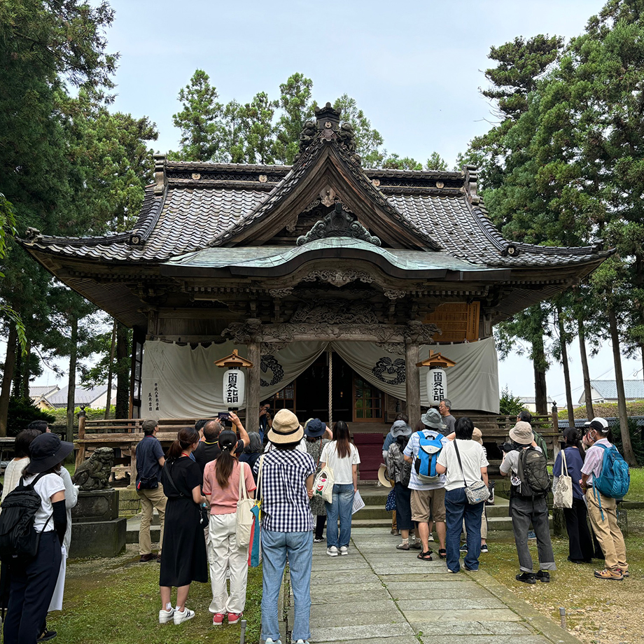 朝から気温も高く暑い1日。堆朱ゆかりの神社「藤基神社」で、宮司さんやファシリテーターを務める長岡造形大学 吉川准教授のお話を聞きながらスタート。