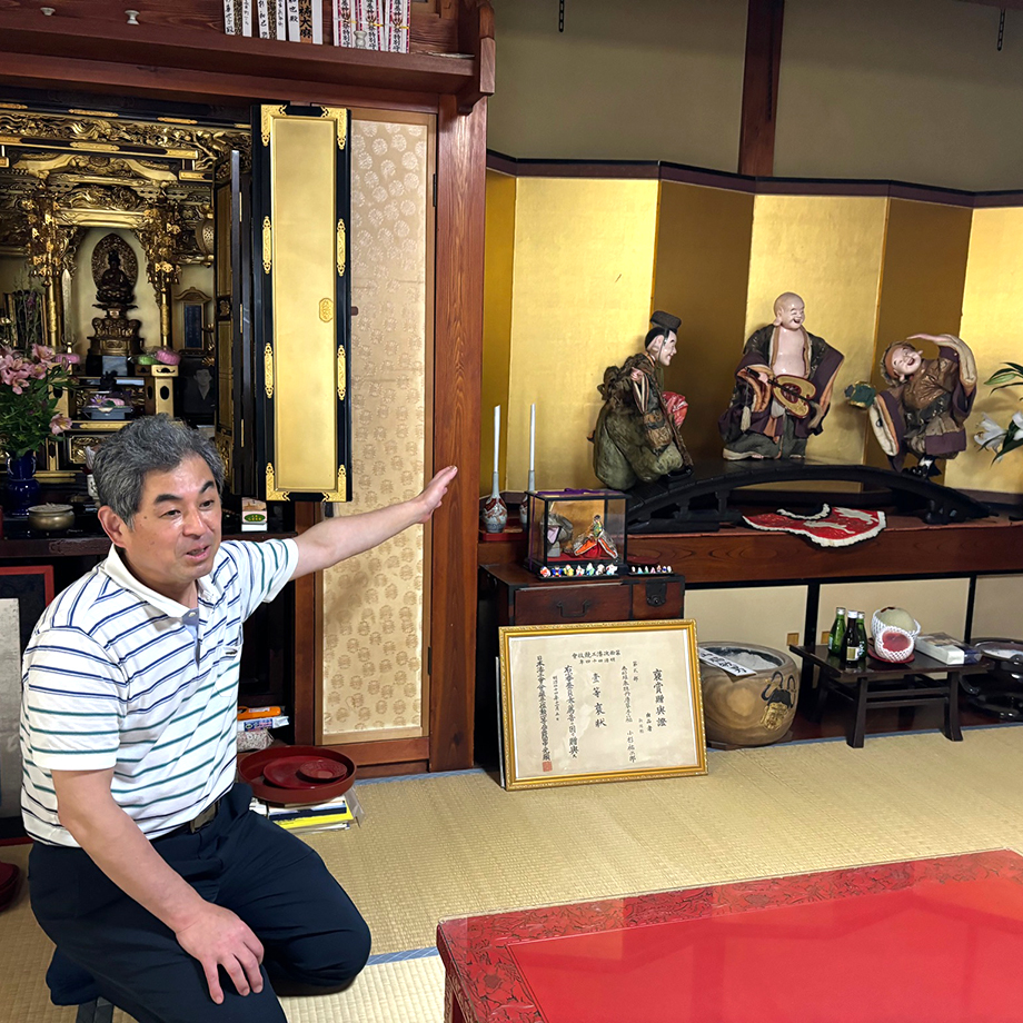 一軒目に訪れたのは小杉漆器店。数々の貴重な調度品を見せていただきながら、塗り師の小杉さんから漆の特徴などお話を伺いました。7月7日の村上大祭の人形さまも運良く飾られており、縁起の良いお姿を間近で拝見。