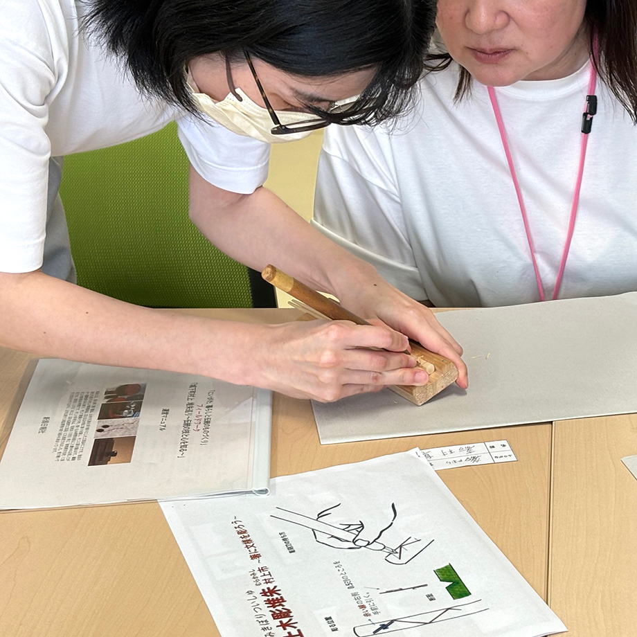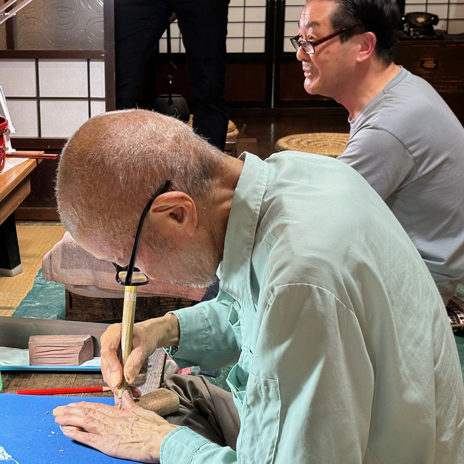 必死になって彫っていると職人の皆さんが各テーブルを順番に回って直接指導してくれ、ここぞとばかりに質問に花が咲きました。自分ではどうしようもなくなってしまって、思わずプロに手を貸してもらう場面も。実際に体験すると、作り手の皆さんの凄さを改めて感じることができます。