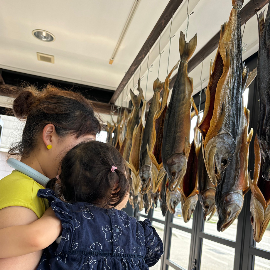 3軒見学したところであっという間に午前の部が終了。工房見学の道中では、村上名物「塩引き鮭」の群れにも遭遇しました。間近で見る鮭の顔はかなりの迫力。