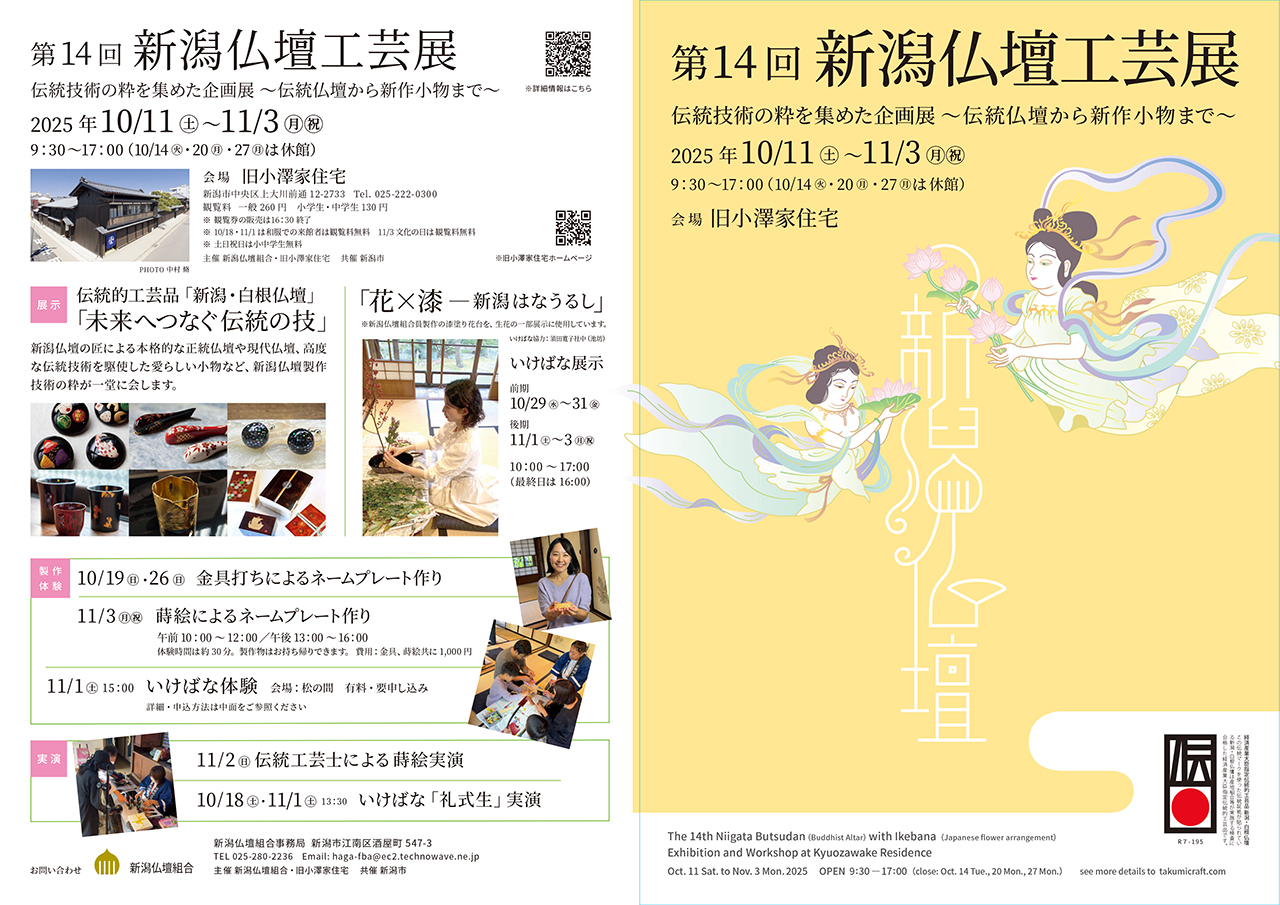 毎年恒例、秋の「新潟仏壇工芸展」が10月より開催されます。今年も会場は旧小澤家住宅にて、熟練仏壇職人の皆さんによる展示、毎年人気の製作体験、実演を行います。