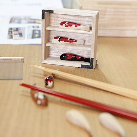 伝統的工芸品 新潟・白根仏壇の塗箔師・羽賀良介さんと蒔絵師・富美子さん。漆や金箔を巧みに操り、日々仏壇の製作に向きあうお二人が、世にも愛らしい鯉の箸置きを生み出しました。錦鯉の愛嬌と優雅さに小千谷で会って一目惚れ、とは生みの親である良介さん。本物の素材だけを使い、一匹一匹、丁寧で緻密な製作工程を重ねています。今回、その宝石のような美しさを更に引き立てるのが、伝統的工芸品 加茂桐簞笥の特製桐箱。アイディアに溢れる職人、鈴木浩昭さんが誂えた、箸置きを鑑賞して楽しむという遊び心の提案です。奇遇にも5月5日に新潟県の観賞魚に指定された錦鯉が、白木の流紋を泳ぐ姿、ぜひ愛でにいらしてください。