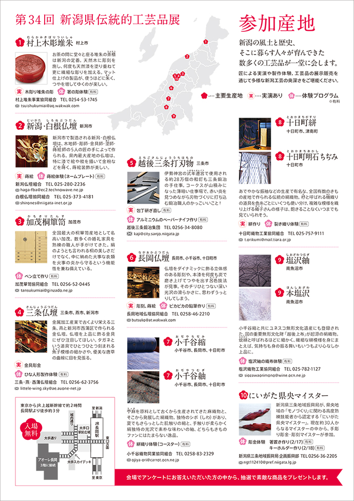 参加産地:村上木彫堆朱/新潟・白根仏壇/加茂桐簞笥/三条仏壇/越後三条打刃物/長岡仏壇/小千谷縮、小千谷紬/塩沢紬、本塩沢/十日町絣、十日町明石ちぢみ(伝統的工芸品 9産地12品目)/県央マイスター