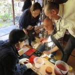2.金箔捺しの実演をしながら製作体験を見守る山田さん。山田さんの道具の使い方など気になることがいっぱい、会話も弾みます