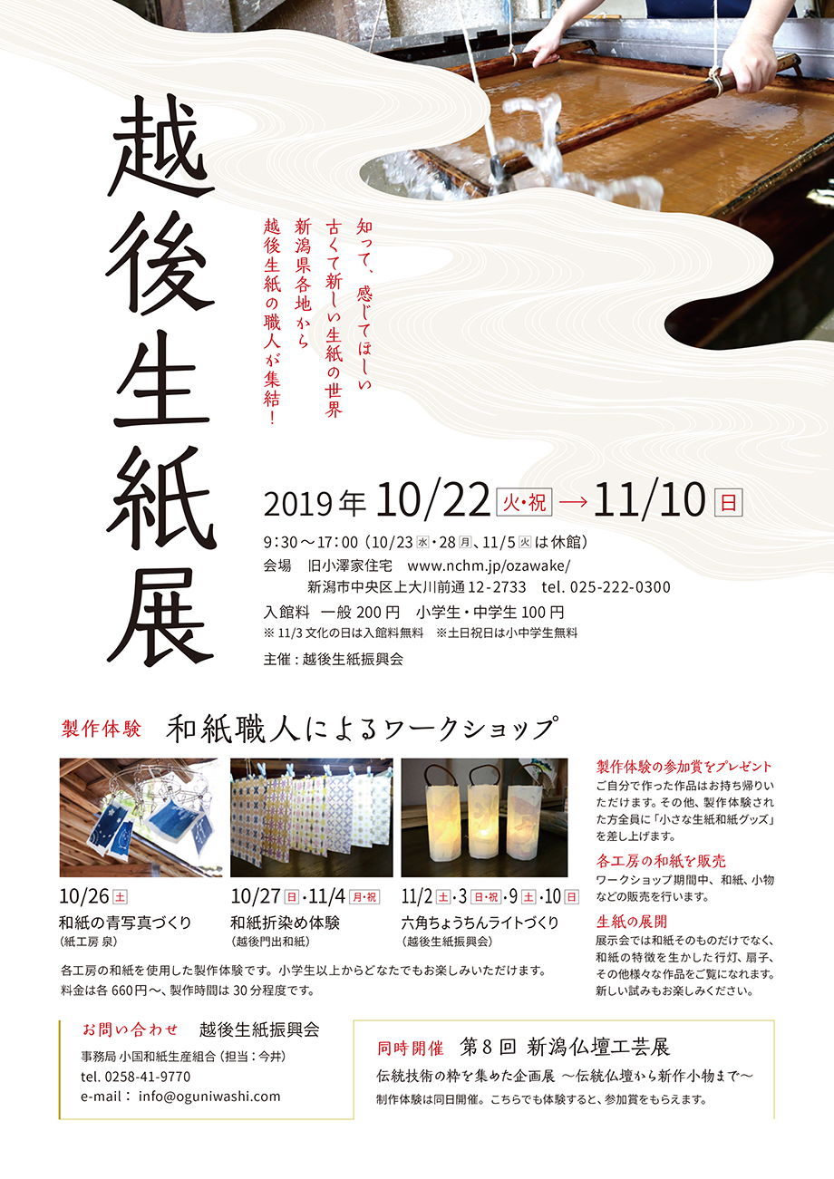 秋の新潟市の湊町、旧小澤家住宅にて、越後生紙和紙振興会の各工房が工芸品の展示だけでなく、3種類のワークショップも開催、また、各工房の和紙・和紙グッズを販売します。しかも今回は、製作体験をされた方にもれなく参加賞を、また、併催の「新潟仏壇工芸展」でも製作体験をされた方には、仏壇小物と和紙の景品が当たるお楽しみくじをご用意しています!