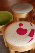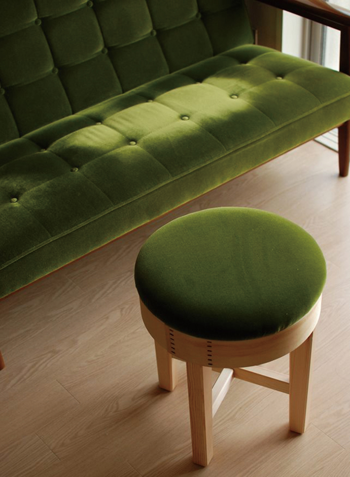 一番左の写真手前のスツールは、沼垂で活動中の染織家、ISANA 中川なぎささんの作品を張地にしたもの(参考商品)