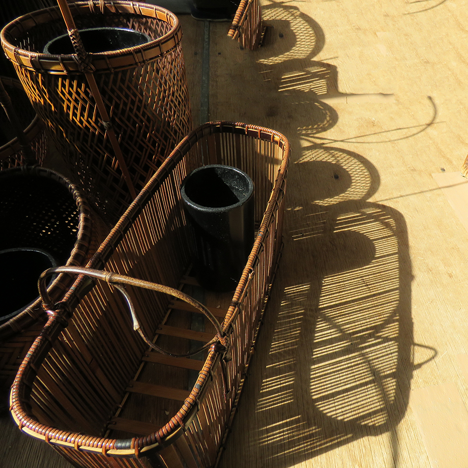 良質の竹を選別する目を養い、選び抜いた真竹や篠竹(しのたけ)を籠の種類ごとに長さ、幅、厚みをそろえ、正確に割ることが第一歩となる。まっすぐな竹が繊細な手つきで均等な短冊に裂かれ、技巧を凝らし編み込まれていくことによって、趣ある端正な花籠に生まれ変わるのだ。