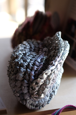 「苧麻は見るのも触るのも初めて。1本1本大切に結びながら編みこんで、自然素材がアクセントのクラッチバッグに仕立てました。」と、苧麻のナチュラルな美しさをすっかり気に入ってくださったようです。