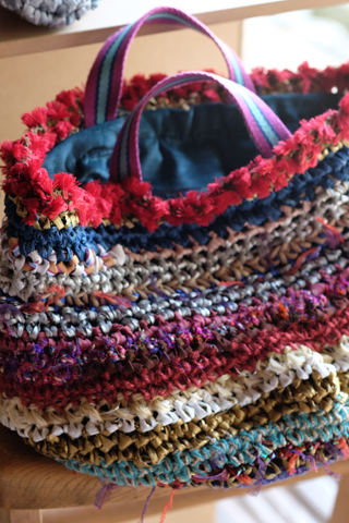 カラフルなchoma bag トート(左)は、アンティークリボンなどと共に編み込まれた苧麻がアクセントに