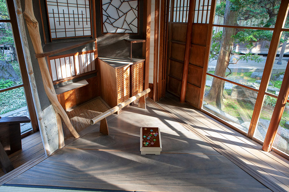 知る人ぞ知る北方文化博物館の名建築 三楽亭は、すべてが三角形と菱形で構成されているという驚くべき構造の茶室兼書斎です。六代目当主が21歳の若さで設計した大胆な挑戦が、名大工の手で具現化されており、ただただ目を見張ります。※建物の保存のため、室内には入れません。
