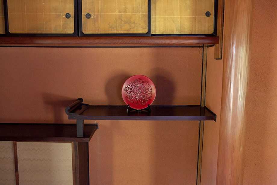 使い方はあなたの自由。収納にも飾り棚にも使えます。床の間に飾られた、家の主人からお客様へのメッセージ? 引戸式扉から覗く酒盃は藤見酒のお誘いかもしれません。