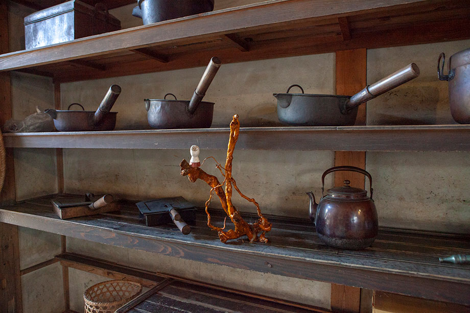 自然豊富な農村地帯にある御殿の台所にも一羽のフクロウが。止まり木は佐渡小木の流木、お鍋ややかんがある棚の間からこちらを覗いていました。