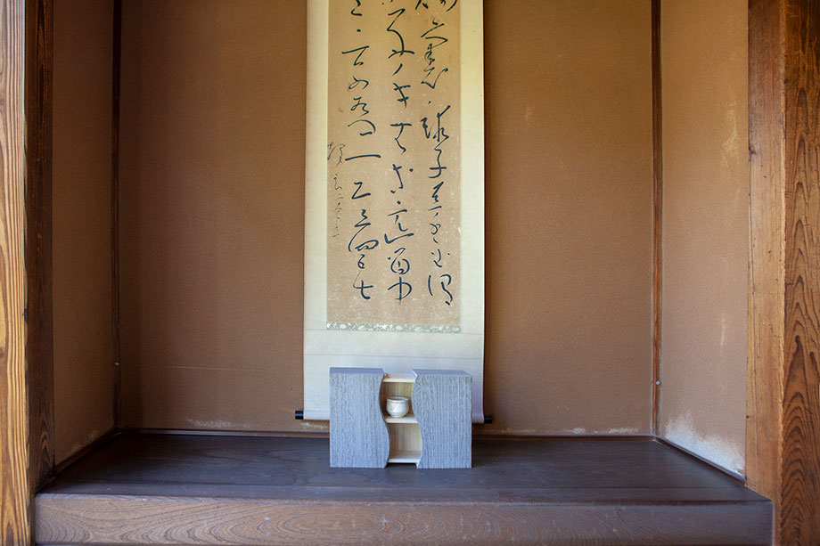 主屋でいちばんの見どころ 大広間の手前にある和室は廊下座敷と呼ばれ、今は待合室、休憩室として利用されています。かつてもお客様たちの待合室だったのでしょうか? 訪れた人たちに歓迎の意を表す床の間には、「想ひ凾(おもいはこ)」。数ある加茂桐簞笥の工房の中でも代々桐凾(きりはこ)作りに特化してきた、野本桐凾製作所の作品です。