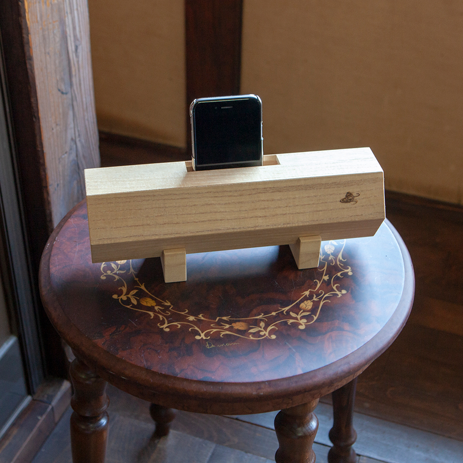 お琴から着想した電源、電池不要のエコなスマホ用スピーカー。アンプなしで、桐の手触りと同様に優しく音が広がります。