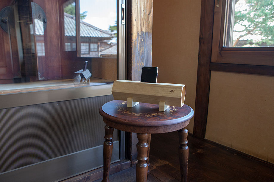 スマホを差し入れるだけで、琴の原理で自然に広がる柔らかな音を楽しむことができます。電源要らずで新時代にふさわしい桐の活用アイディアにも、鉋がけの伝統技術が光ります。まっさらな白肌の桐エコスピーカーが、大先輩のタンスにガラス越しに挨拶しているようでした。