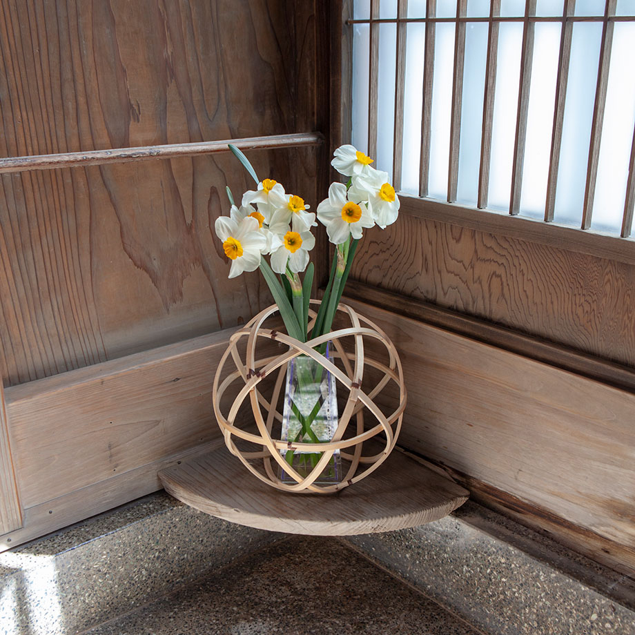 曲げわっぱと同様に桧を曲げ、桜の皮で綴じて作った球体にアクリルの花器を添えました。