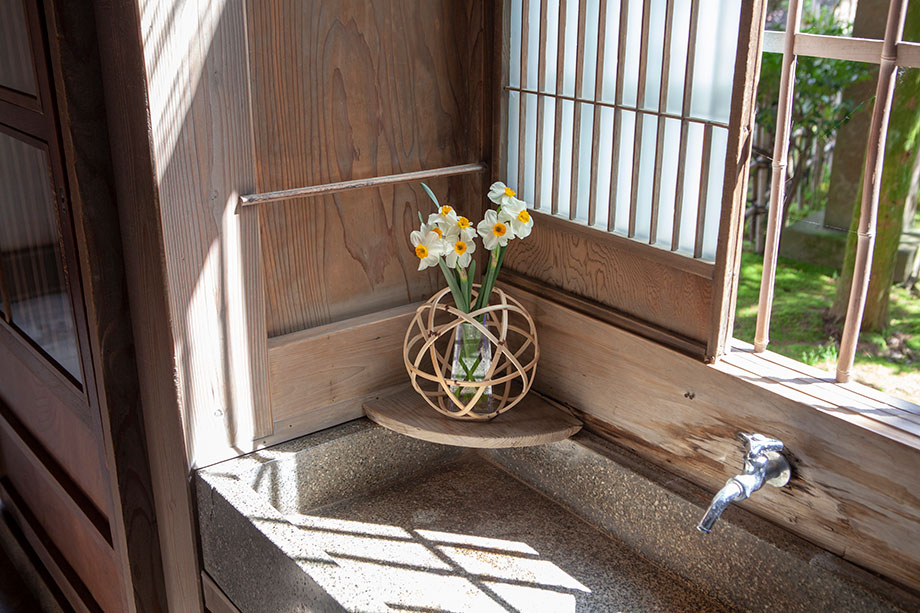 主屋玄関から入って靴箱に靴を入れ、振り返ったところの水飲み場の所にあったのが、寺泊山田の曲物 足立茂久商店の新作〈花結び〉。