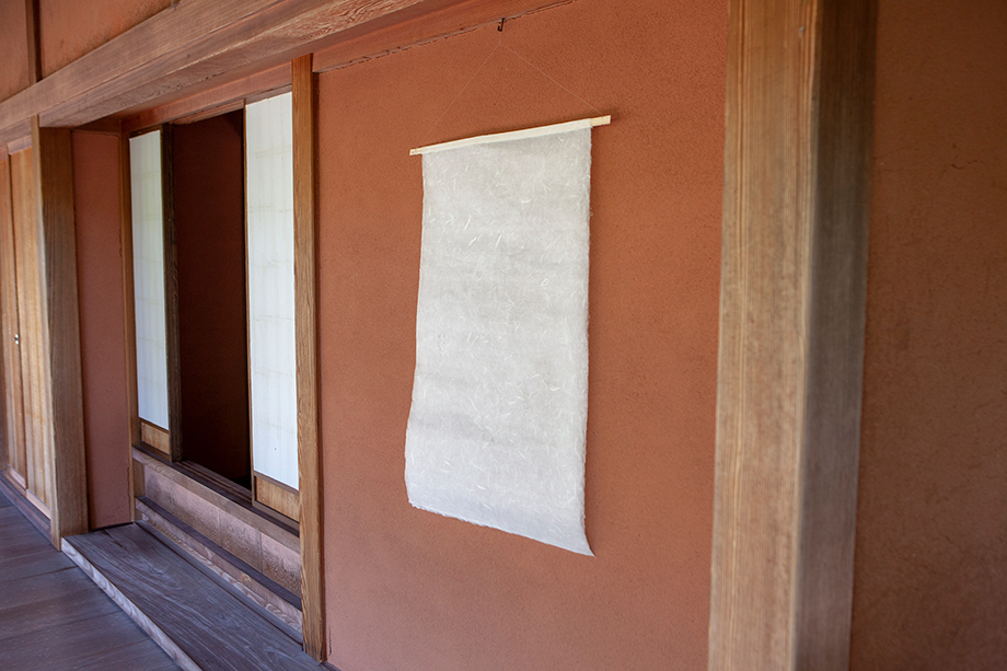 大広間から裏座敷へ通じる赤い土壁には、薄い雲龍紙が風が吹くにまかせてそよぎます。越後生紙の手漉き和紙職人、紙工房 泉の作品です。