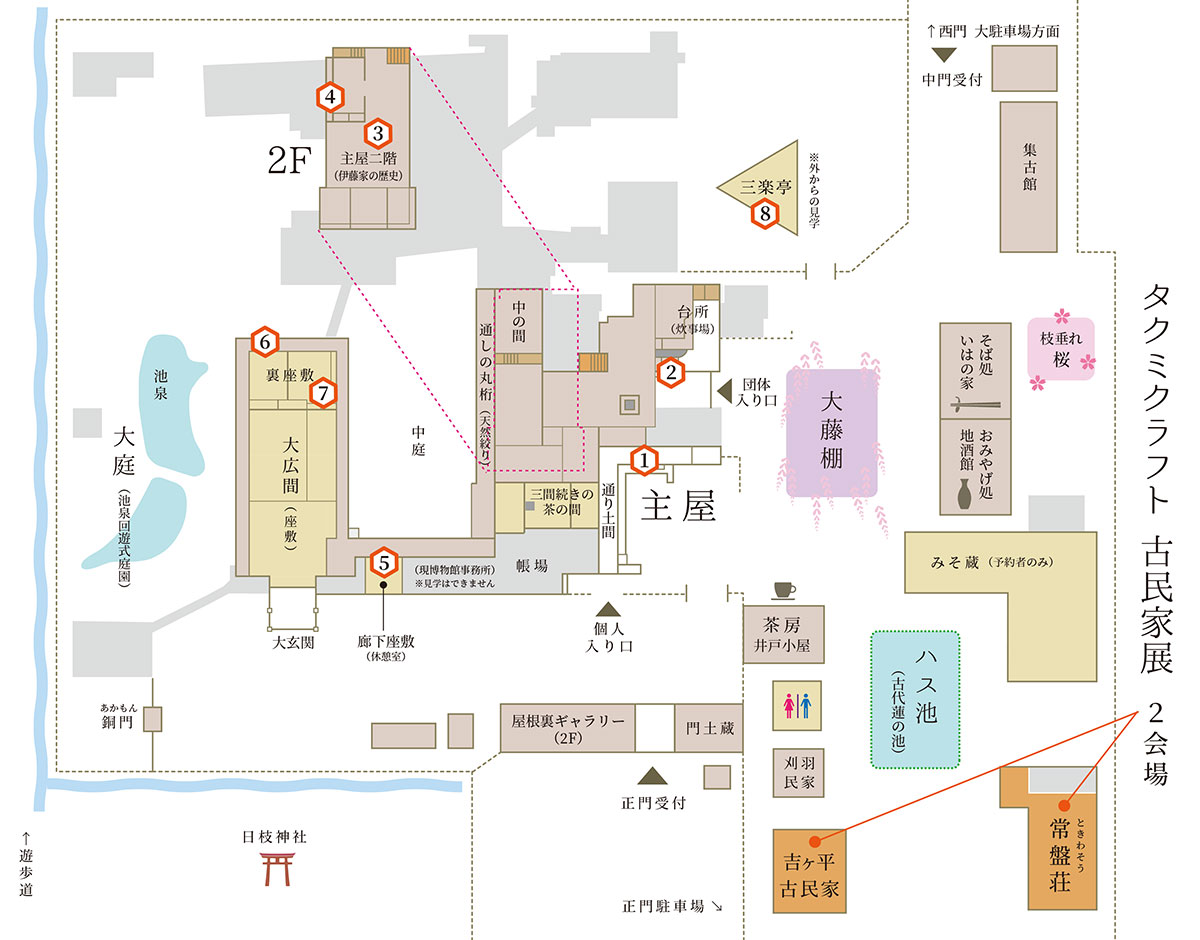 歴史深い主屋ほか8ヶ所でのスポット展示は、その場所と作品にそれぞれ関わりがありました。博物館の名所を紐解きながら、その種明かしをしていきます。