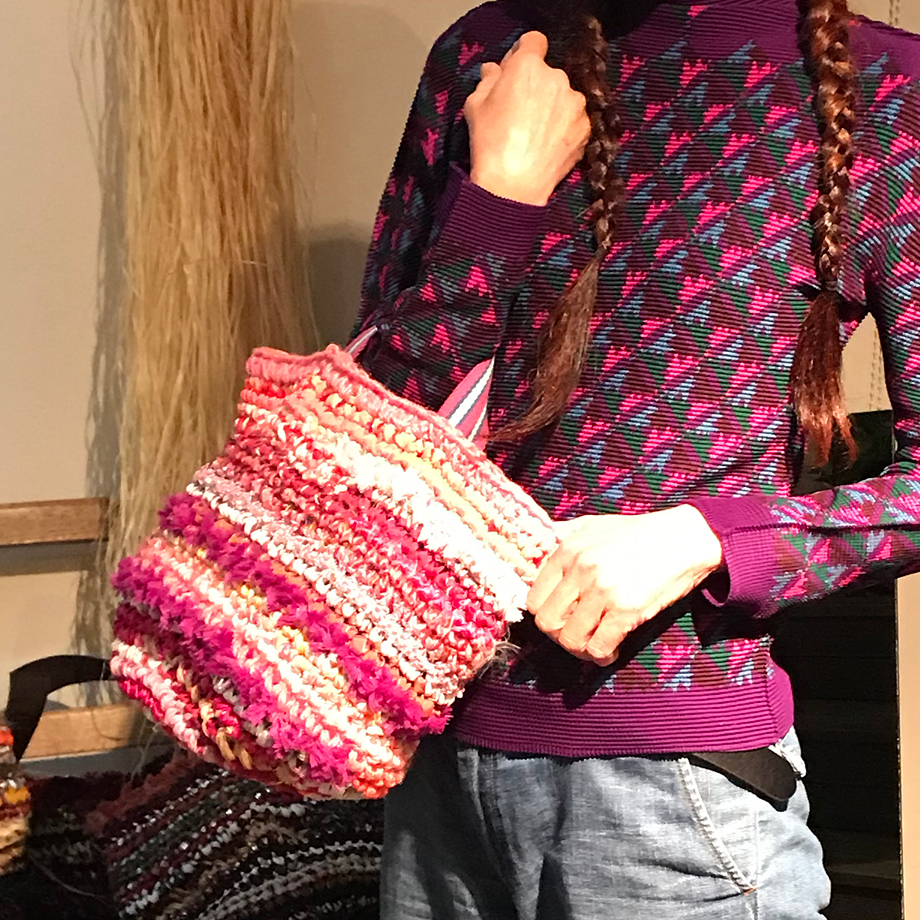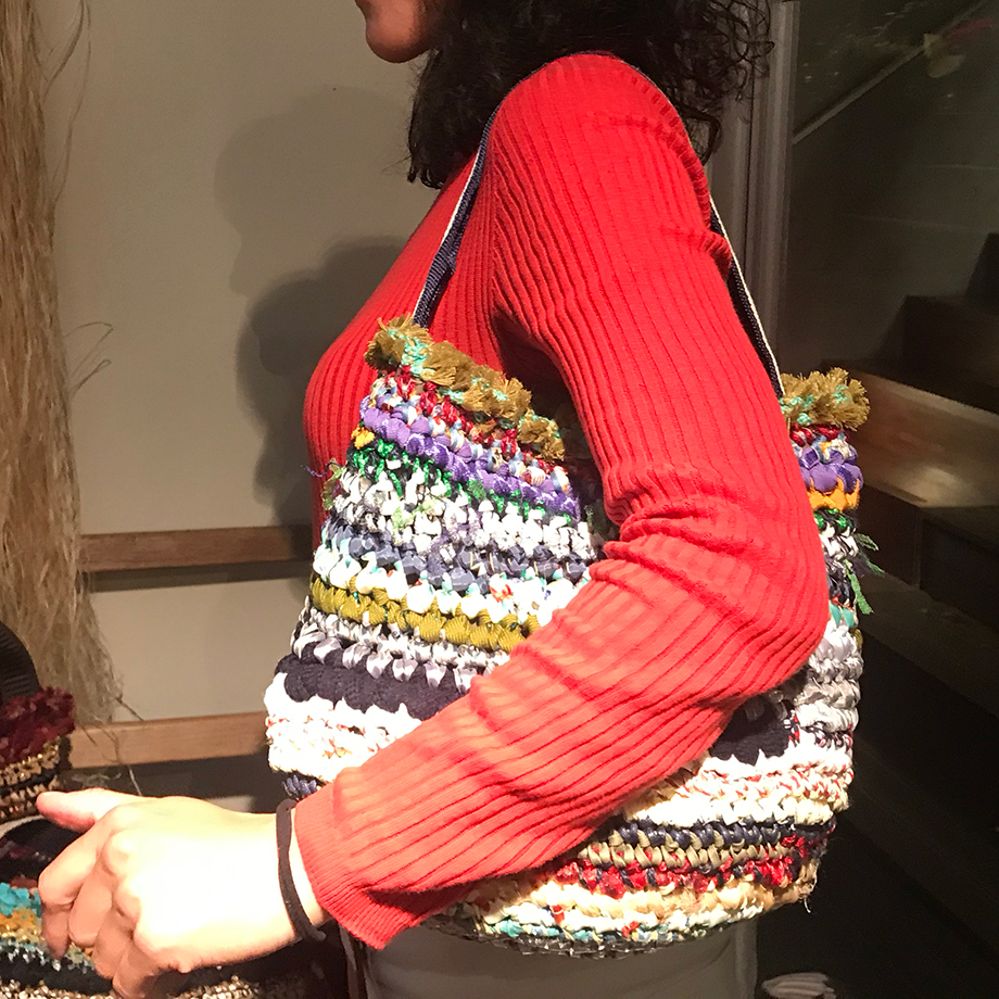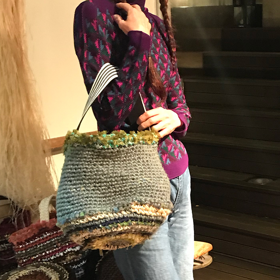 もう一人のメイン作家 羽越しな布のつくり手 大滝ジュンコさんの新作。しな布の良さを生かした、クールなバゲットバッグが並びます。