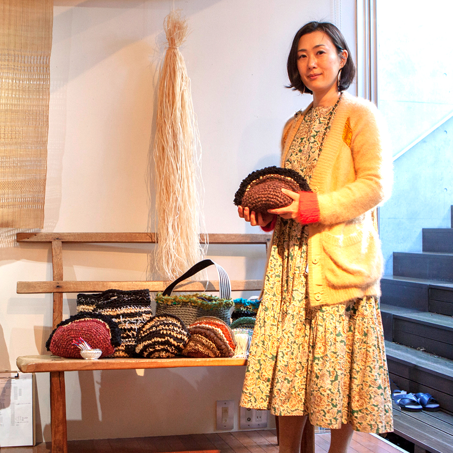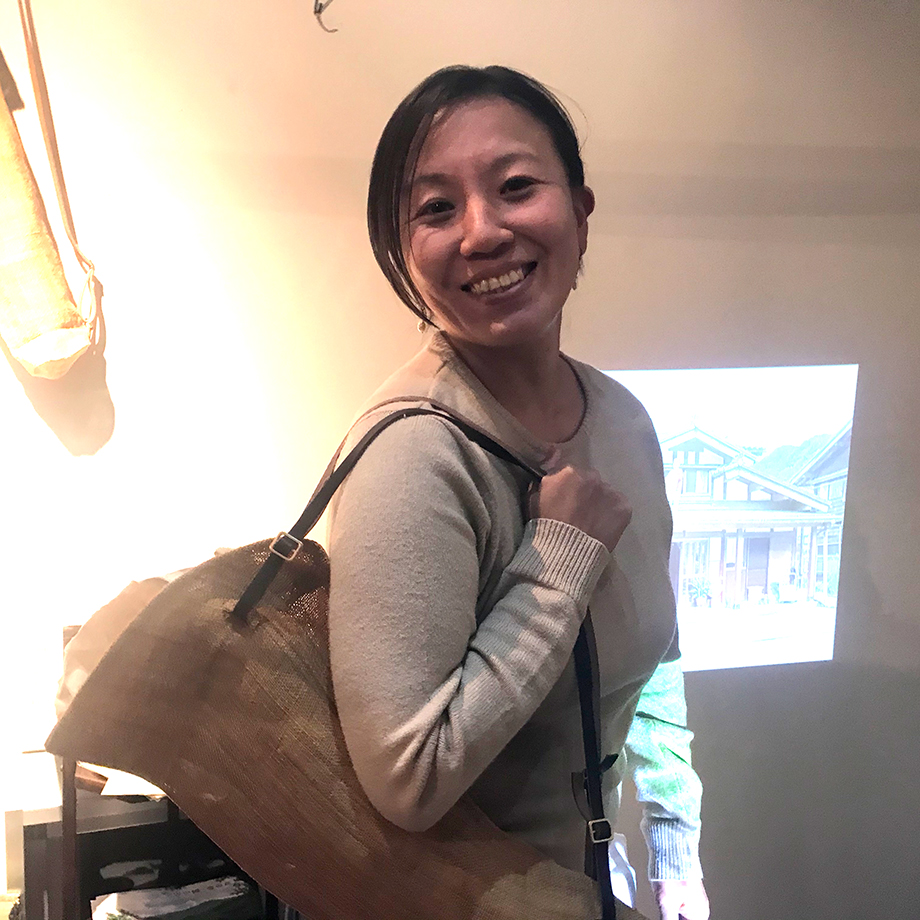 piquantさん 苧麻バッグとともに。お天気の良い日はギャラリーの中庭も展示会場に早変わり。