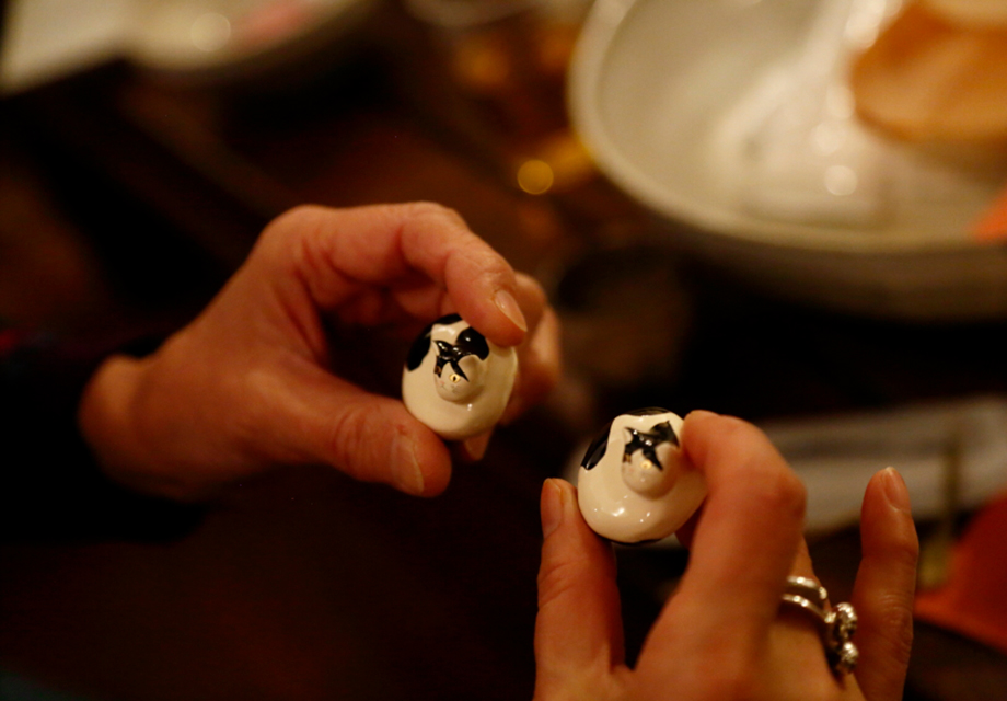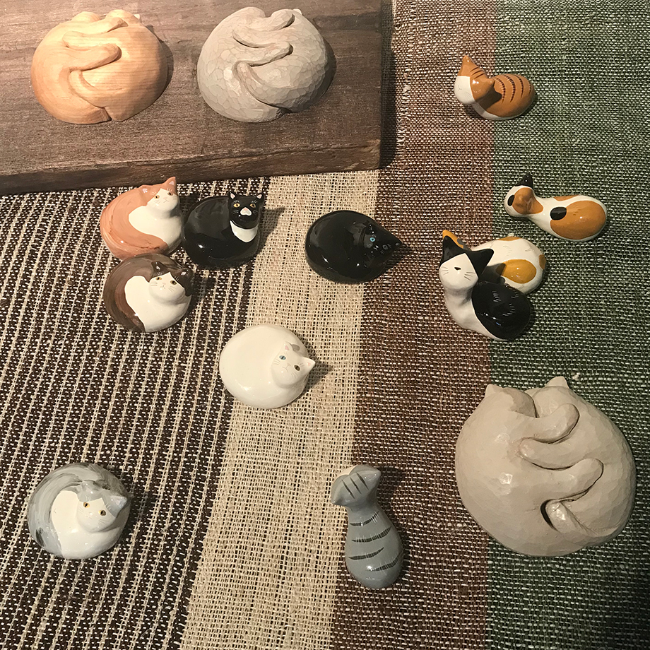 こちらを見上げるお顔がなんとも愛くるしい、桑原さんの干支木目込人形。本塩沢と塩沢紬がふんだんに使用されています。仏壇工芸士とクリエイターによる〈ネコオキ〉漆のはし置きシリーズ。羽賀富美子さんと造形作家 さいとうようこさんによる〈トリオキ〉はとても人気でした。