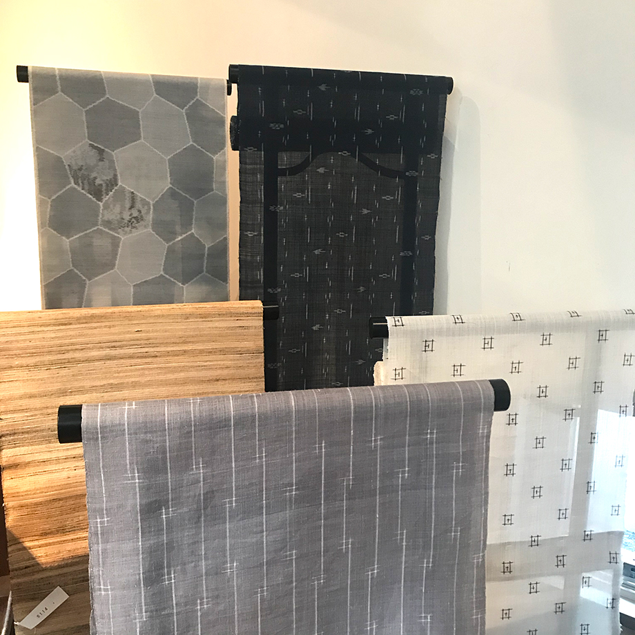 大滝さんの背後に見えるのは、彼女が考案した複雑な織が美しい羽越しな布の反物です。反物がかかっているのは丸めたシナの木の皮。こちらも産地 山熊田から、遠路はるばる東京へやってきました。