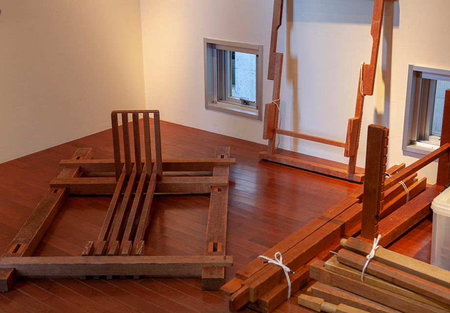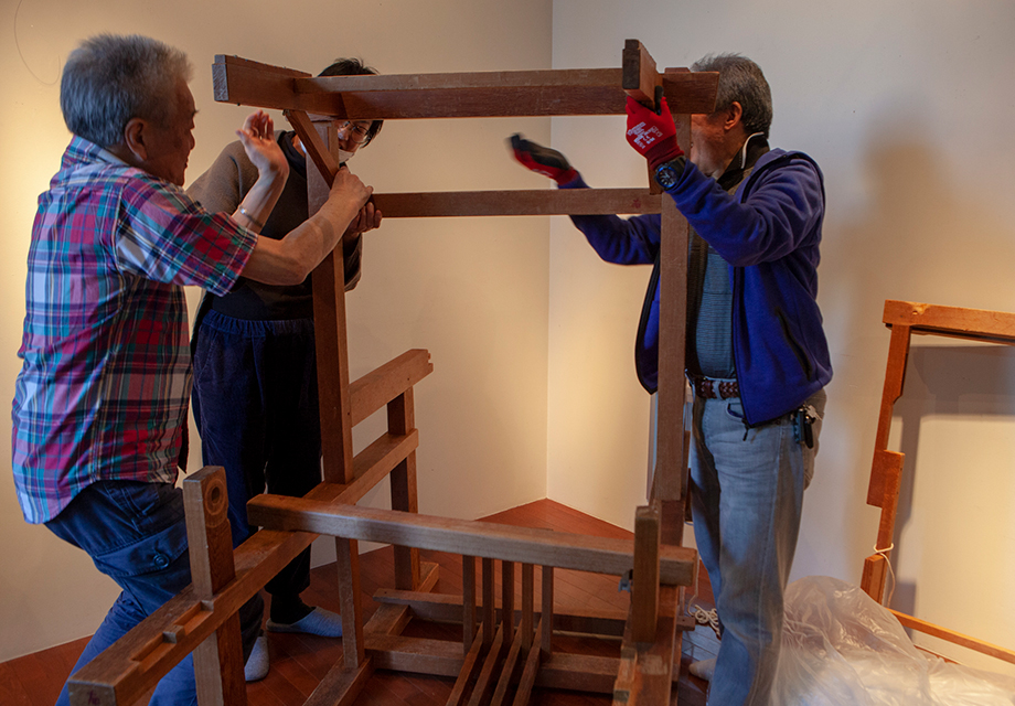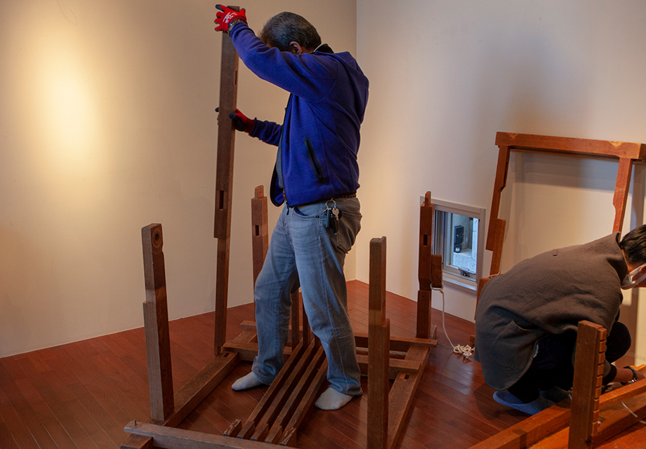 今回展示の象徴的な存在でもあった高機は、日頃、塩沢織物の産地で使用されているもの。メイン作家のお一人である伝統工芸士 桑原博さんが、自らの車で運び込んでくださいました。塩沢から到着した高機は運搬のため解体されていたため、会場に到着してから組み立てられました。新潟各地の学校などで子どもたちに高機での実演・製織体験を指導している桑原さんも、ここまで細かく解体して運んだのは初めてとのこと。特別な電動工具も使わずに、手だけであれよあれよと機が組み上げられていく様は、すでに素晴らしいショータイムでした。最後に、糸の複雑な設置が済めば準備完了です。