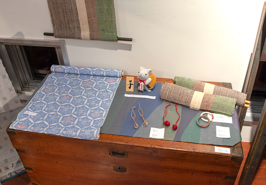ギャラリーの中心に置かれた高機を取り囲むのは、桑原さんが手がけた重要文化財 越後上布や塩沢織物の貴重な反物の数々。天井には小千谷織物のシェードが川のように流れ、彩りを添えています。